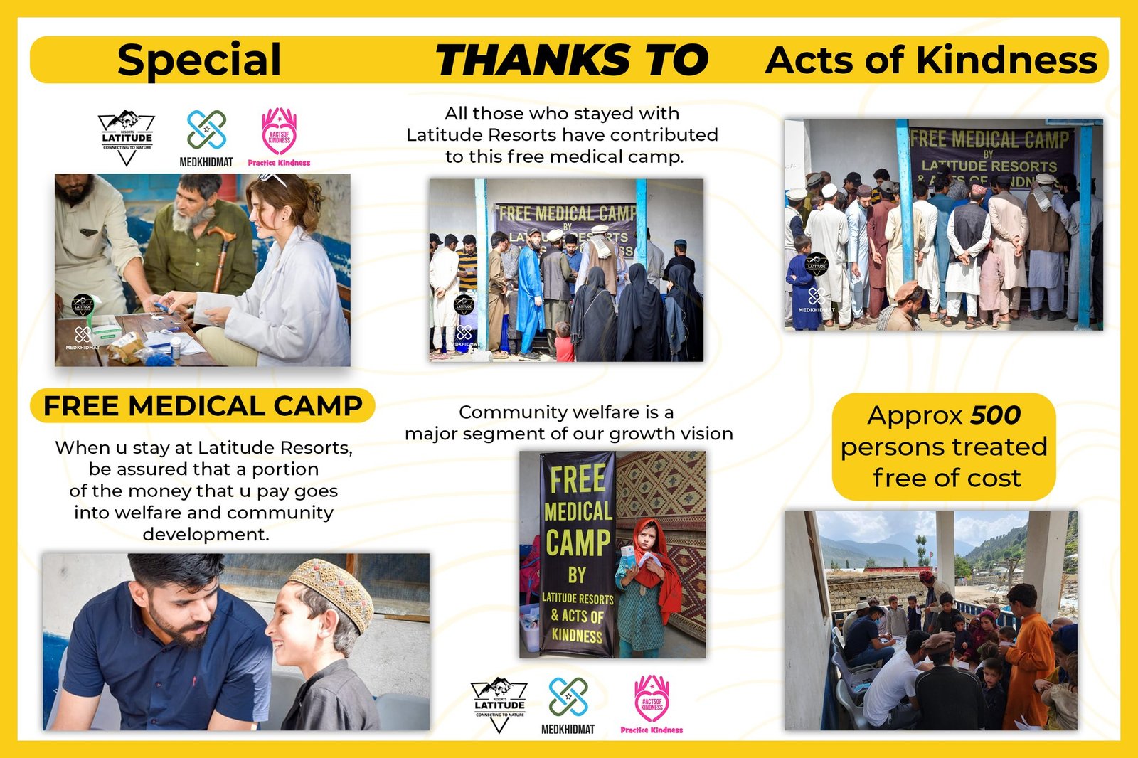 Latitude Resorts, in collaboration with Acts of Kindness and MedKhidmat, proudly organized a Free Medical Camp to support community welfare. Through this initiative, approximately 500 people received free medical checkups, medicines, and diagnostic tests. Every guest at Latitude Resorts contributes to such meaningful projects, as a portion of their stay goes toward community development. This medical camp reflects Latitude Resorts’ commitment to making a positive impact in Kumrat Valley.
